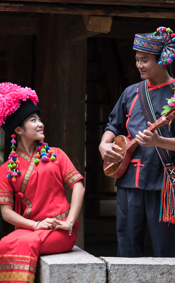 云南壯族主要聚居在文山州,人口114萬(wàn),民間的村寨大多依山傍水。壯族擅長(zhǎng)種植水稻,有太陽(yáng)崇拜和長(zhǎng)老崇拜的風(fēng)俗,視銅鼓為重器,厚愛(ài)銀飾,善烹制五色花米飯,能歌善舞,熱情好客。進(jìn)入景區(qū)壯族村,迎面有祭祀龍王的龍柱,兩邊是先民繪制的天王崖畫和為紀(jì)念傳說(shuō)洪水泛濫時(shí)幫助先民度過(guò)劫難而建的石葫蘆亭。祭祀玉皇大帝的昊天閣和傳說(shuō)能驅(qū)邪納福的碩大銅鼓聳立在廣場(chǎng)兩側(cè)。桿欄式和麻欄式民居、壯族青年社交休憩的“情廊”、村...