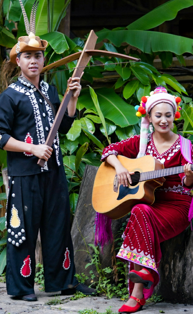 德昂族人口約1.7萬(wàn),主要分布在德宏州和保山市的潞西、梁河、瑞麗、隴川、隆陽(yáng)等縣區(qū)。民居多為草排覆頂竹木結(jié)構(gòu)的干欄式建筑,眼前的德昂村建筑納入了能容納數(shù)十人居住的德昂大房子,氈帽頂?shù)男》孔樱€有頗具浪漫色彩的大公房、小公房……還建有“龍陽(yáng)塔”標(biāo)志及佛教奘房、佛塔。德昂族民間普遍信奉南傳佛教,民俗活動(dòng)與佛事活動(dòng)關(guān)聯(lián)緊密。潑水節(jié)、開(kāi)門節(jié)、關(guān)門節(jié)是重大節(jié)日。德昂族服飾色彩豐富,口頭文學(xué)特別是民歌創(chuàng)作活動(dòng)...